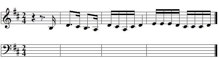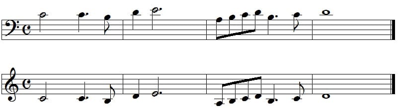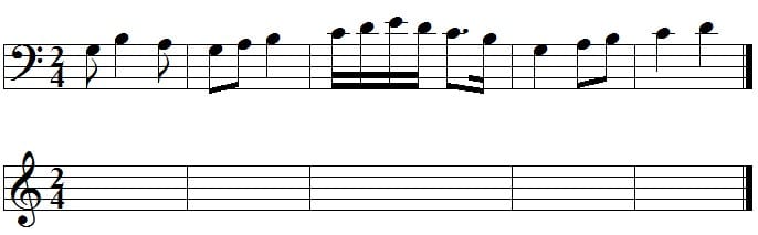In grade 2 you may be asked to use one or two ledger lines above or below the stave. Questions may also relate to rewriting extracts in bass or treble clef but keeping the pitch the same.